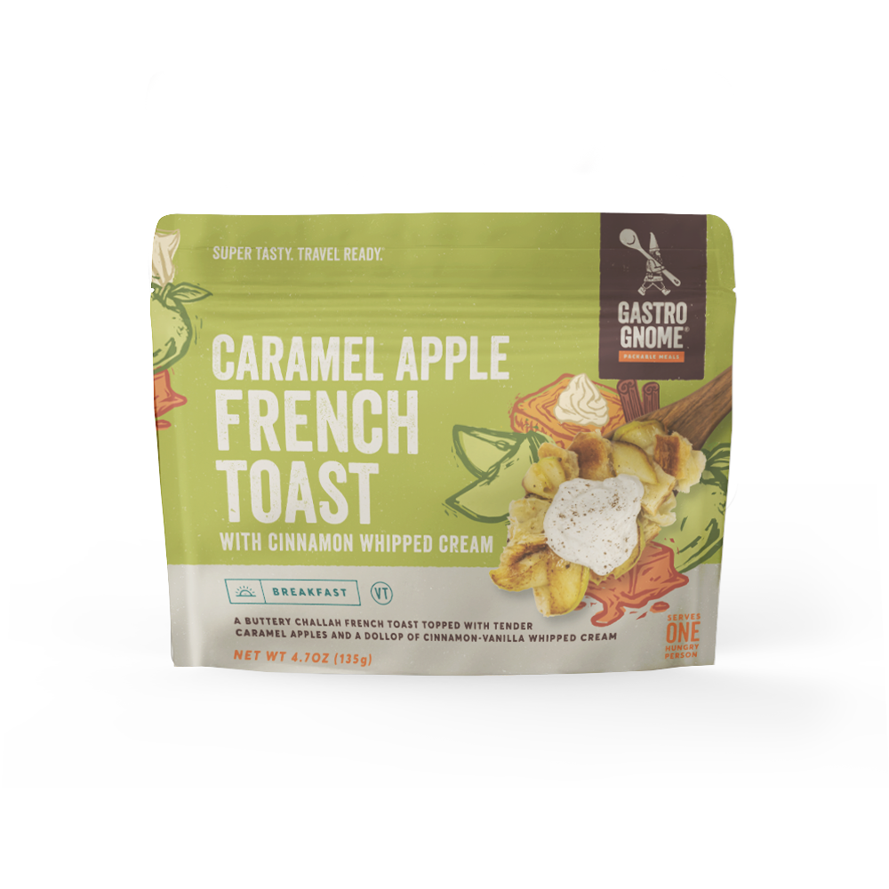 A buttery challah french toast topped with tender caramel apples and a dollop of cinnamon-vanilla whipped cream