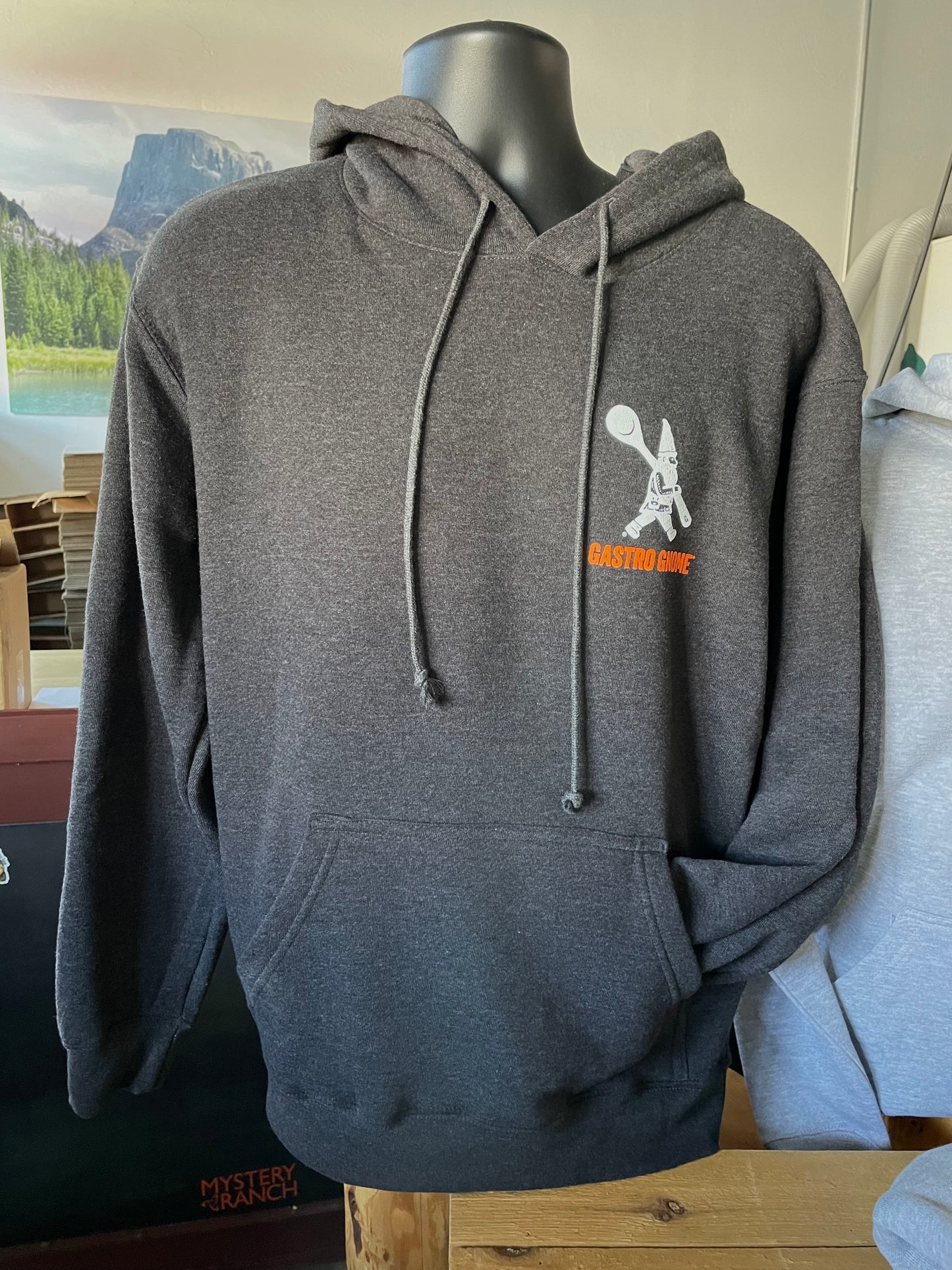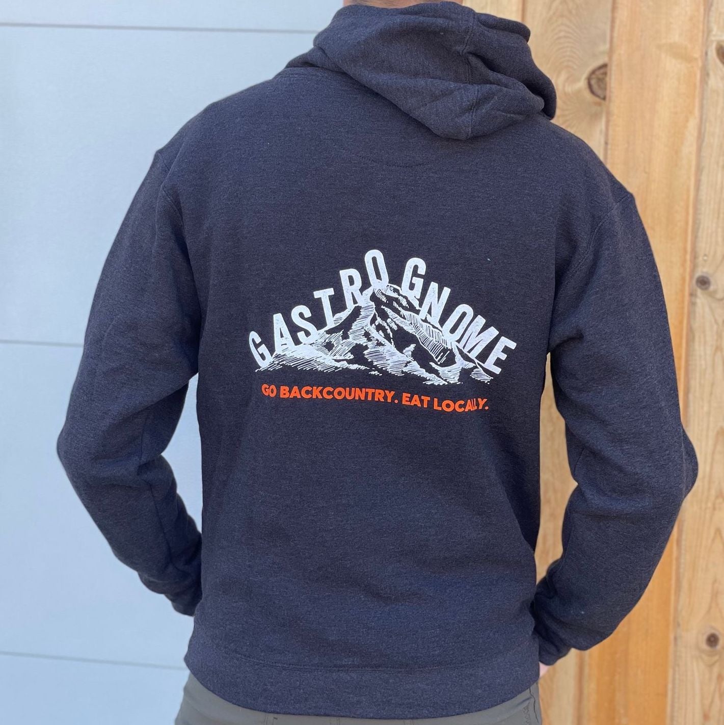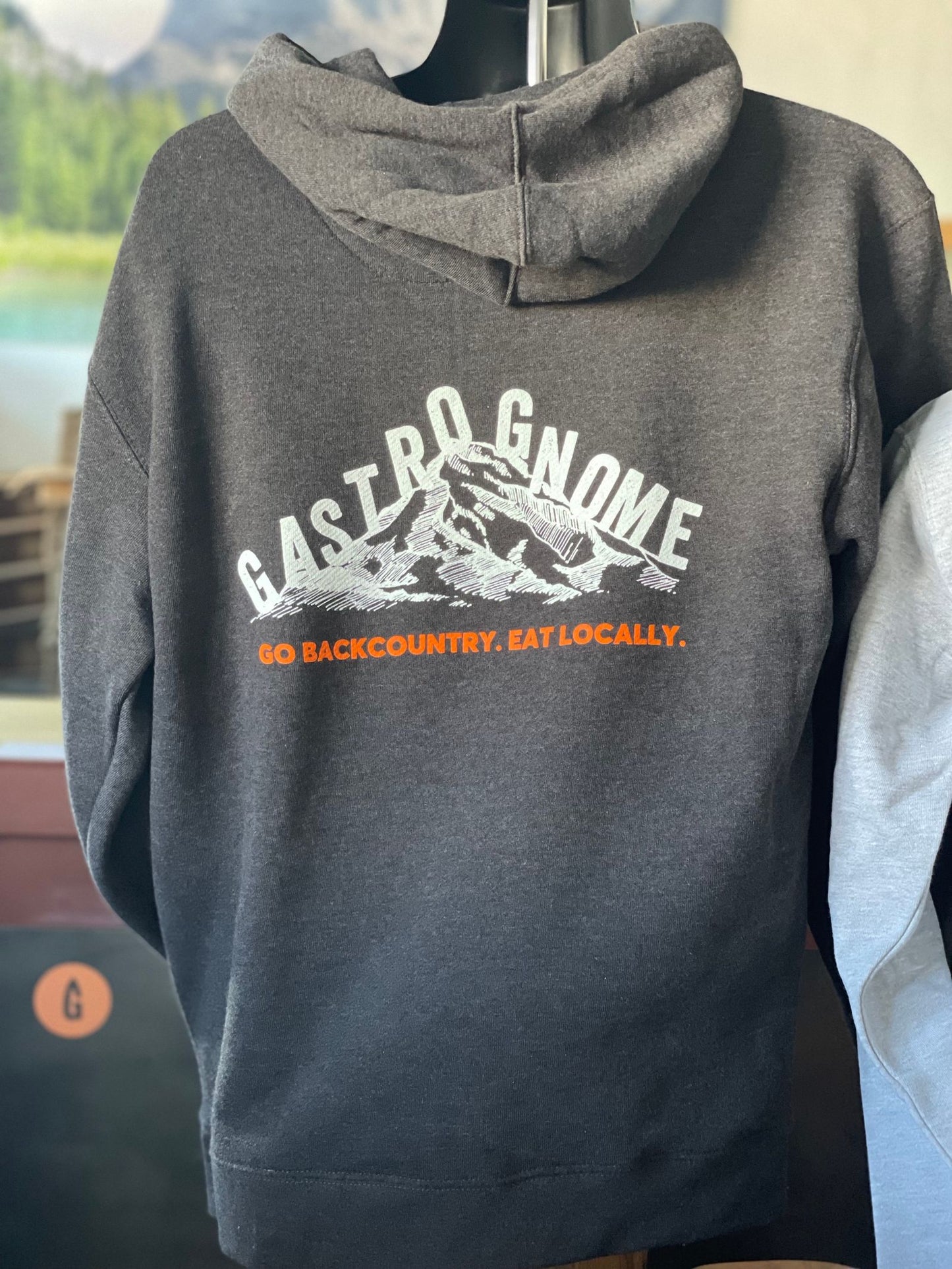 This sweatshirt is super soft and is the perfect addition to your winter wardrobe. Screen printed on both sides with a large Gnome on the front, and Gastro Gnome across the mountains on the back. Featuring our favorite Gnome phrase- "Go backcountry. Eat Locally."